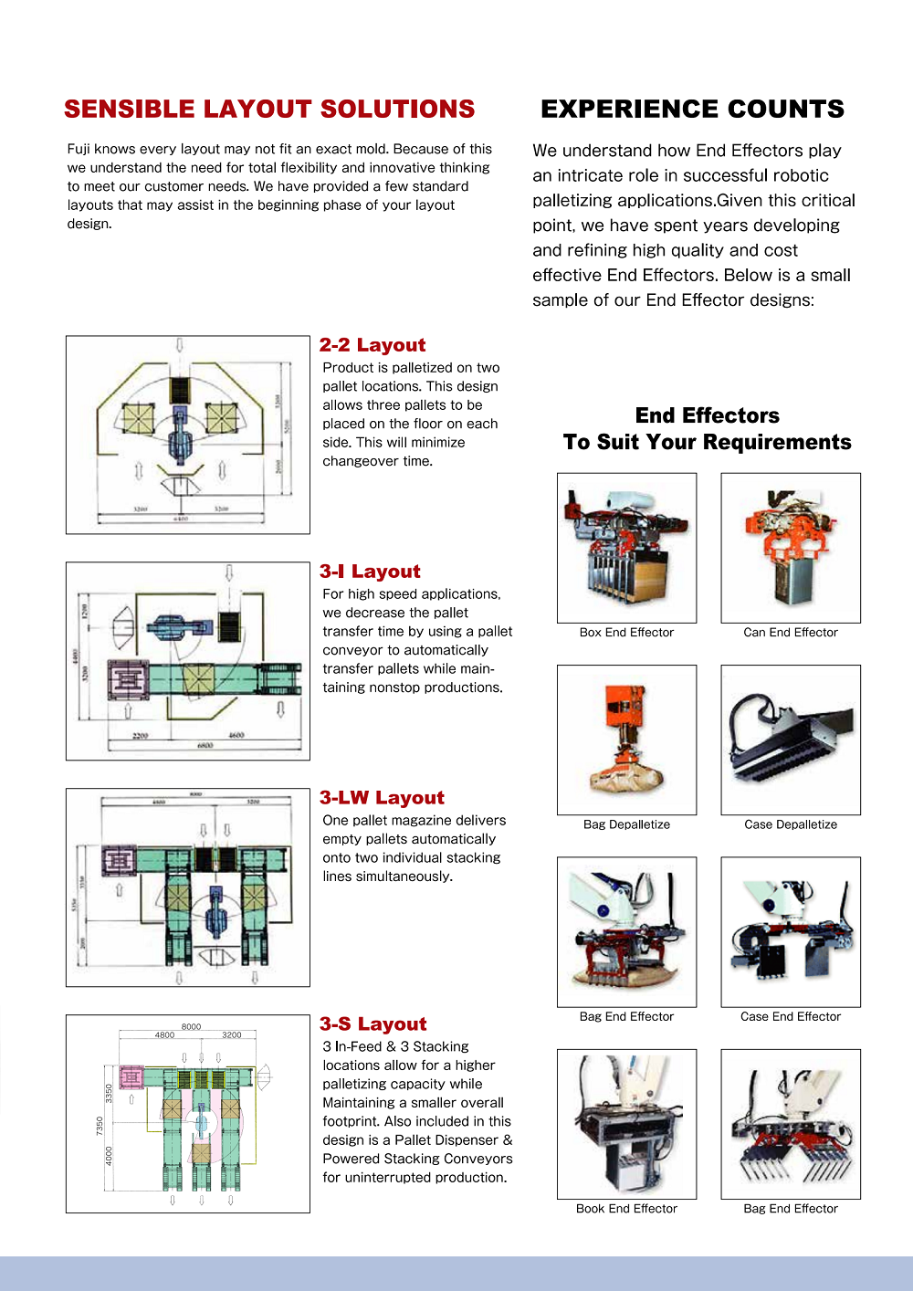 The EC-171 palletizing robot produced by Fuji Conveyor Industry Co., Ltd. (FUJI YUSOKI KOGYO CO., LTD.) is one of the most advanced palletizers in the world. It has simple operation, accurate positioning, high efficiency, energy saving, and maintenance. Convenience, low failure rate, fast palletizing speed, etc., can stack bags, boxes, barrels and other products.